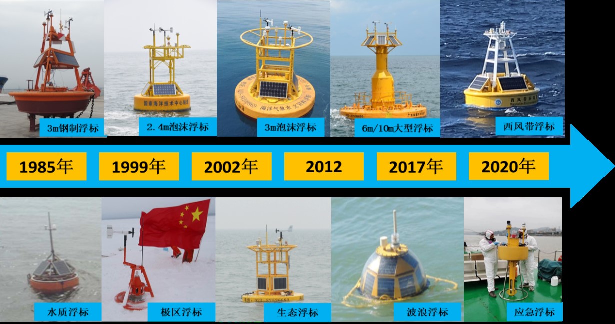 經過多年的科研攻關和不懈努力,現已研制多種尺寸規格的浮標,包括直徑10 m、6 m、3 m、2.4 m和2 m等多種型號。在功能上有通用型的水文氣象觀測浮標,專用型的海洋生態水質監測浮標、波浪浮標和應急核輻射監測浮標等。已在國內海洋環境觀測和海洋科學研究中發揮了巨大作用。