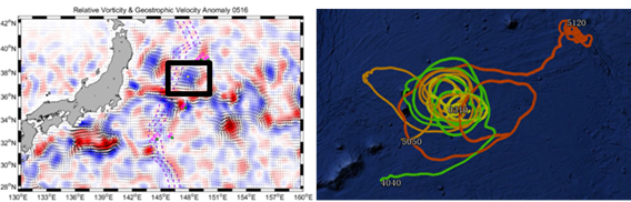 注:左圖中黑框內為中尺度渦位置(根據2018516日衛星海表面異常數據反演的相對渦度和地轉流);右圖為浮標的漂移軌跡。