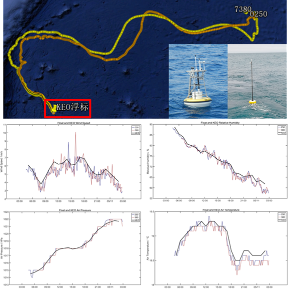 注:250380為漂流式海氣通量浮標編號;紅色和棕色圓點為浮標漂流軌跡;漂流式海氣通量浮標觀測數據為10分鐘1次的原始數據,KEO數據為延時1小時1次數據;截止目前,KEO浮標只有1天的觀測數據供比測用,其中海表面溫度數據缺失;漂流式海氣通量浮標隨洋流逐漸遠離KEO浮標,紅色方框范圍內浮標軌跡點為比測位置。