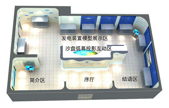 中國海洋能技術成果展廳位于國家海洋技術中心海洋監測設備動力環境實驗樓2樓203室,展廳面積約200平方米。展廳的設計突出國際化,使之具有強烈的時代感和科技感;并給人以強烈的視覺沖擊,突出大氣、明快,耳目一新之感。整個展廳分為序廳、簡介區、發電裝置模型展示區、沙盤弧幕投影互動區以及結語區。