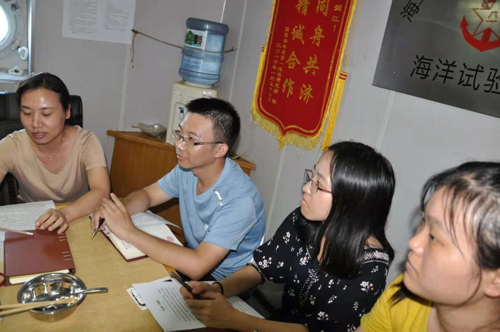 生物光學現場組長李芝鳳同志就本次試驗談了一些切身體會,工作中大家團結協作,擰成一股繩,勁往一處使,保質保量獲取珍貴的現場數據;生活中大家相互照應,克服了重重困難,讓她忘掉了出海前的憂慮和擔心。大氣光學現場測量組長賈迪同志指出要將材料內容與出海實際情況相結合,用紀律和規矩約束自己,從而有利于指導行動,規范自身行為。學生黨員王婧例舉了發生在她身邊不按規矩辦事的實例,發人深省。學生黨員黃筱燦認為黨員同志應當將黨的紀律和規矩作為約束自身的準則,為群眾樹立典范。
