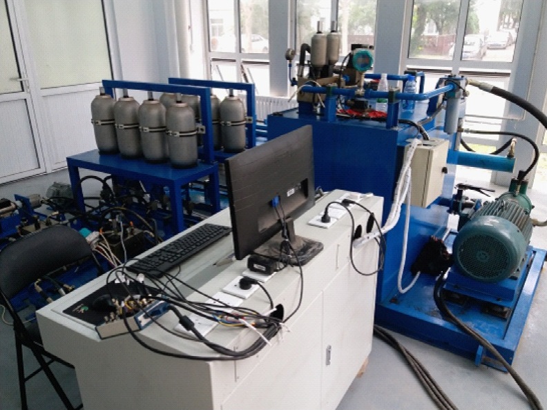 項目組利用液壓測試平臺分別模擬了不同海域不同波況條件下液壓裝置的輸入特性,對波浪能發(fā)電裝置液壓系統(tǒng)進(jìn)行了測試,分析了液壓裝置的工作特性與效率。液壓系統(tǒng)包括:浮力擺液壓缸、液壓缸控制閥組、高壓蓄能器組、馬達(dá)發(fā)電機組、馬達(dá)控制閥組、低壓蓄能器組、補油系統(tǒng)和配套電控系統(tǒng)。液壓缸往復(fù)運動產(chǎn)生高壓液壓油,高壓油經(jīng)過液壓缸控制閥組整流為單向流,經(jīng)過馬達(dá)控制閥組帶動液壓馬達(dá)-發(fā)電機旋轉(zhuǎn)。試驗結(jié)果表明液壓系統(tǒng)在模擬的海域波況條件下均正常運行達(dá)到預(yù)期的設(shè)計要求。在測試完成的基礎(chǔ)上,現(xiàn)已將液壓系統(tǒng)安裝到浮式平臺設(shè)備艙內(nèi)。(能源室)