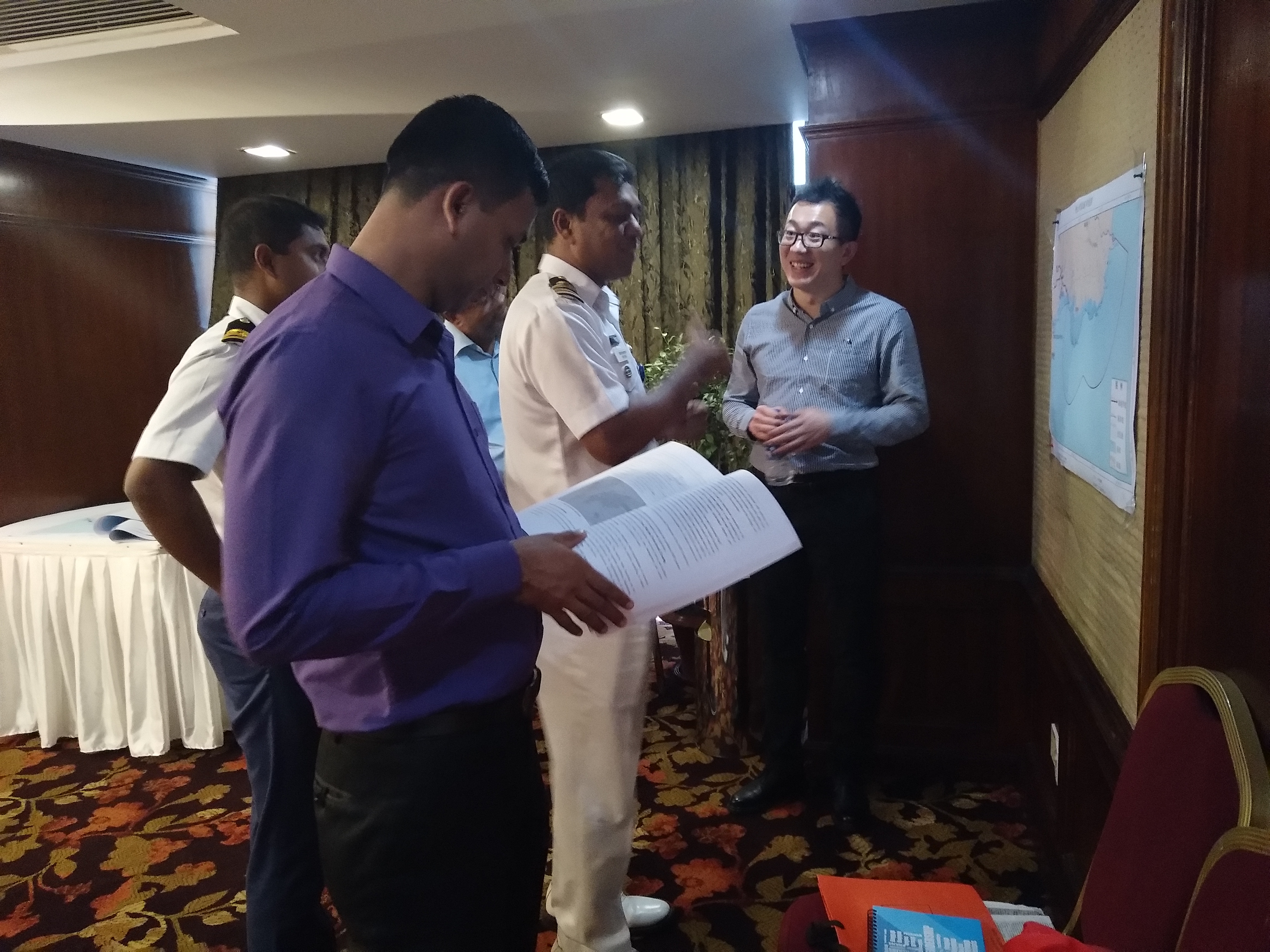 來自我中心海域室、近海室、能源室和工程中心的專家們圓滿完成了本次培訓班的授課任務。課堂氣氛活躍,除了專家們的講授,學員們積極踴躍的參與課堂討論,分享本國海洋發展實際情況并積極尋求解決方案。為了加深學員們對海洋空間規劃技術方法的理解及應用,中心專家采用了案例模擬教學法,五人一組,在實踐中運用所學方法進行資源分析評價,劃分海洋功能區,各組需對其他組的功能區劃分結果進行同行評議,這就等同于功能區劃過程中的重要一環:公眾參與。案例模擬的教學方法使學員們不僅從理論上了解了海洋功能區劃技術方法,也從實踐中體驗到海洋功能區劃的流程,得到了孟加拉國學員的一致好評,取得了非常好的教學效果。
