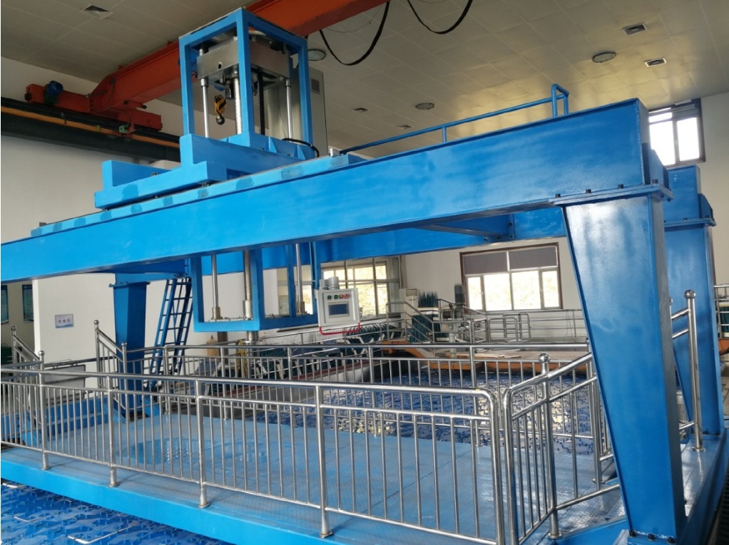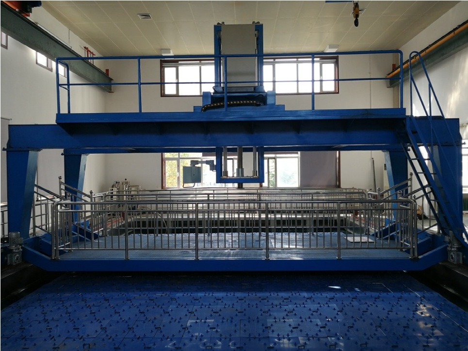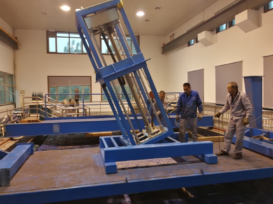 移動實驗平臺按照設(shè)計方案制造完成后,實驗室人員于10月13日到制造現(xiàn)場完成基本結(jié)構(gòu)和功能的預(yù)驗收。11月3日至5日,開展了移動實驗平臺結(jié)構(gòu)件的進(jìn)場、安裝等工作。在此過程中,遇到了諸如實驗室空間有限等問題,通過實驗室人員和安裝人員的共同努力,在未破壞實驗室內(nèi)原有設(shè)備的前提下,成功完成了移動實驗平臺的組裝工作。11月6日至7日,開展了移動實驗平臺的調(diào)試工作,調(diào)試完成后的移動實驗平臺縱向運動范圍15m,深度方向運動范圍不小于2.3m,可接延長桿至6m,小車橫向運動范圍2.3m,回轉(zhuǎn)角度范圍±360º,回轉(zhuǎn)控制誤差:不大于±0.1°,水聲測試系統(tǒng)計算機通過RS232通訊接口,采用無線數(shù)傳模塊與現(xiàn)場控制器通訊。經(jīng)調(diào)試驗證,移動實驗平臺全部功能均滿足設(shè)計方案的指標(biāo)要求,順利通過驗收。