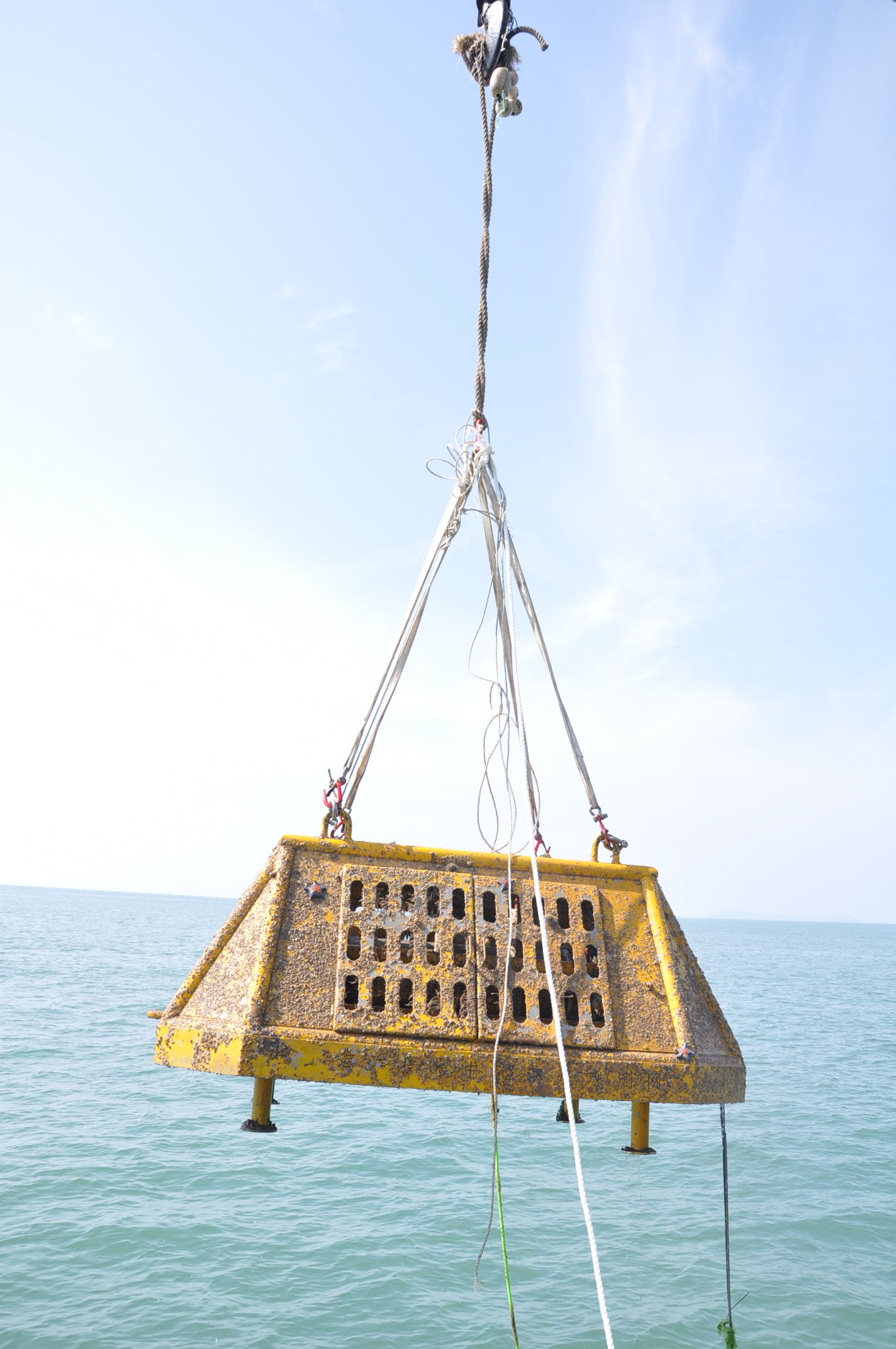 項目組于去年8月、10月和今年5月,對系統(tǒng)開展了三次維護工作,主要包括:更換故障傳感器、清理框架及艙體上的附著海生物以及生態(tài)傳感器定標。海上的情況復雜多變,項目負責人制定了詳細的工作計劃,劃分工作組并指定一名組長,明確每個人的分工。蓬萊海域?qū)儆诘湫偷陌肴粘保S護工作盡量選擇在約2個小時的平潮期,多個工作組需協(xié)同作業(yè),包括船只定位、節(jié)點打撈、傳感器拆卸、框架及艙體清理等,每次均在有限的時間內(nèi)完成維護工作。