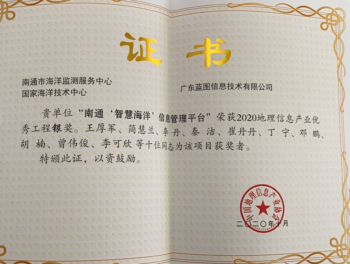 10月23日-24日,2020中國地理信息產業大會在南寧召開。大會表彰了2020地理信息產業優秀工程獎,該獎項由國家測繪地理信息局、科學技術部批準設立。我中心作為第一完成單位的“南通‘智慧海洋’信息管理平臺”項目獲得2020地理信息產業優秀工程銀獎。