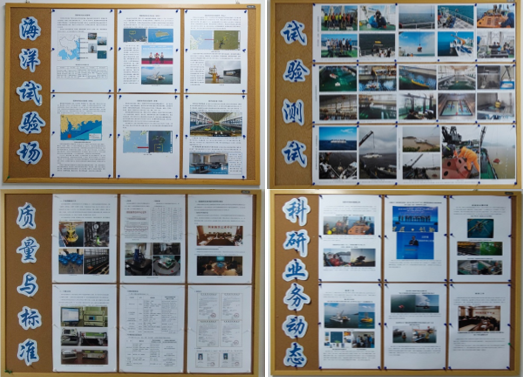宣傳欄包括業(yè)務(wù)工作與科研動(dòng)態(tài)兩個(gè)方面,內(nèi)容豐富、形式靈活、圖文并茂,包括“海洋試驗(yàn)場(chǎng)”、“試驗(yàn)測(cè)試”、“質(zhì)量與標(biāo)準(zhǔn)”和“科研業(yè)務(wù)動(dòng)態(tài)”四個(gè)板塊。“海洋試驗(yàn)場(chǎng)”板塊系統(tǒng)展示了國(guó)家海洋綜合試驗(yàn)場(chǎng)的規(guī)劃、布局,以及各場(chǎng)區(qū)的規(guī)劃與建設(shè)情況;“試驗(yàn)測(cè)試”板塊展示了基于海洋試驗(yàn)場(chǎng)與實(shí)驗(yàn)室開展的試驗(yàn)測(cè)試、海洋能發(fā)電裝置性能現(xiàn)場(chǎng)測(cè)試過(guò)程影集;“質(zhì)量與標(biāo)準(zhǔn)”板塊展示了質(zhì)量檢驗(yàn)和計(jì)量溯源工作的技術(shù)能力、設(shè)備設(shè)施、人員資質(zhì)以及分標(biāo)委會(huì)的標(biāo)準(zhǔn)化工作情況;“科研業(yè)務(wù)動(dòng)態(tài)”板塊展示了試驗(yàn)場(chǎng)中心近期的科研工作進(jìn)展與業(yè)務(wù)工作成果。