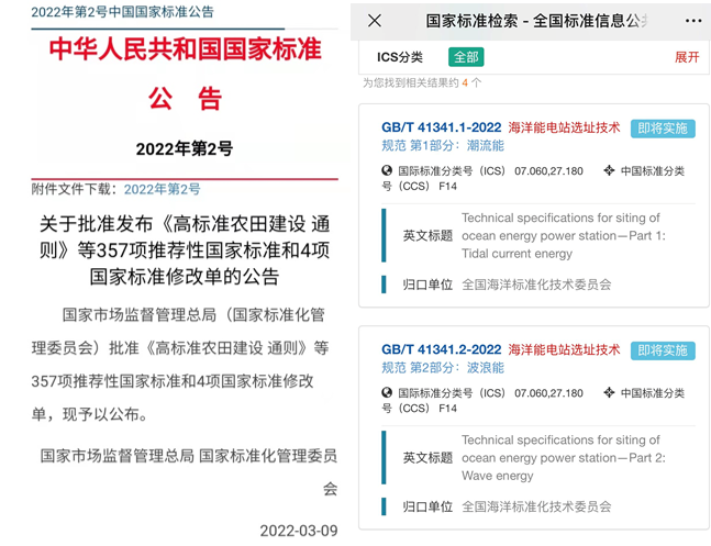 2022年3月9日,經國家市場監督管理總局、國家標準化管理委員會批準,由我中心承擔的《海洋能電站選址技術規范 第1部分:潮流能》(GB/T 41341.1-2022)和《海洋能電站選址技術規范 第2部分:波浪能》(GB/T 41341.2-2022)2項國家標準正式發布實施。《規范》確立了海洋能電站的選址內容、技術要求與數據資料、選址過程與方法,規定了潮流能電站的選址內容、技術要求與數據資料、選址過程與方法和選址報告編制的要求,是指導我國海洋能電站選址的基礎性標準。《規范》的正式實施將為潮流能和波浪能電站選址技術提供支撐和依據,研制海洋能電站選址技術規范,規范海洋能發電站計算方法,是大規模開發利用海洋能資源的重要技術保障。(海洋能發展中心 吳國偉)