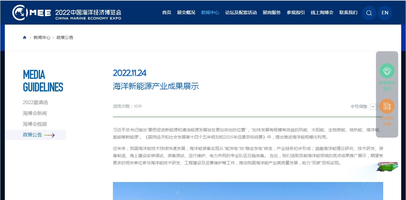業(yè)務工作11月24日,海洋新能源產業(yè)成果展示網頁正式上線2022中國海洋經濟博覽會官網首頁。該網頁重點展示了黨的十八大以來,我國海洋新能源領域在技術創(chuàng)新、裝備制造、公共服務平臺建設等方面取得的成果。