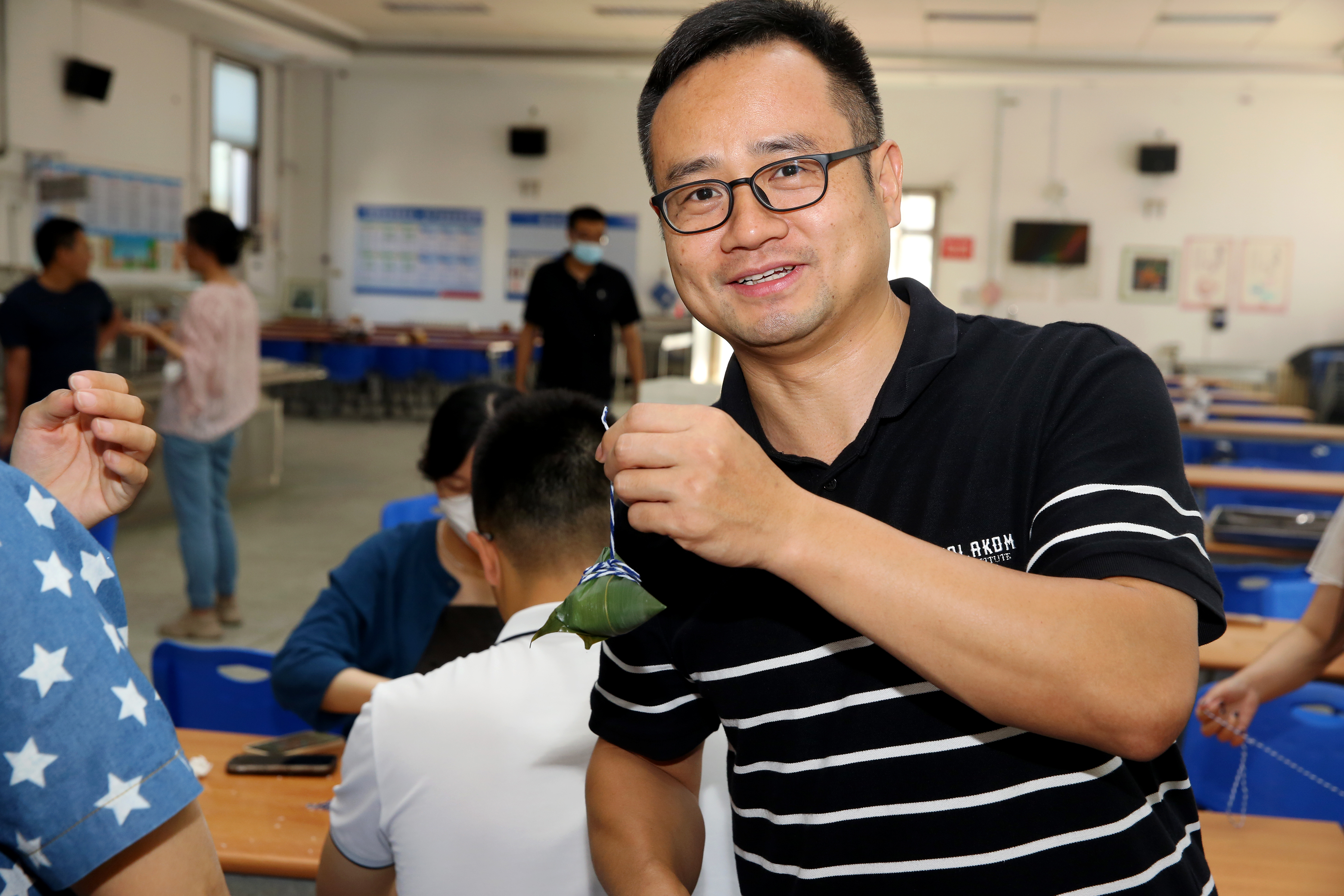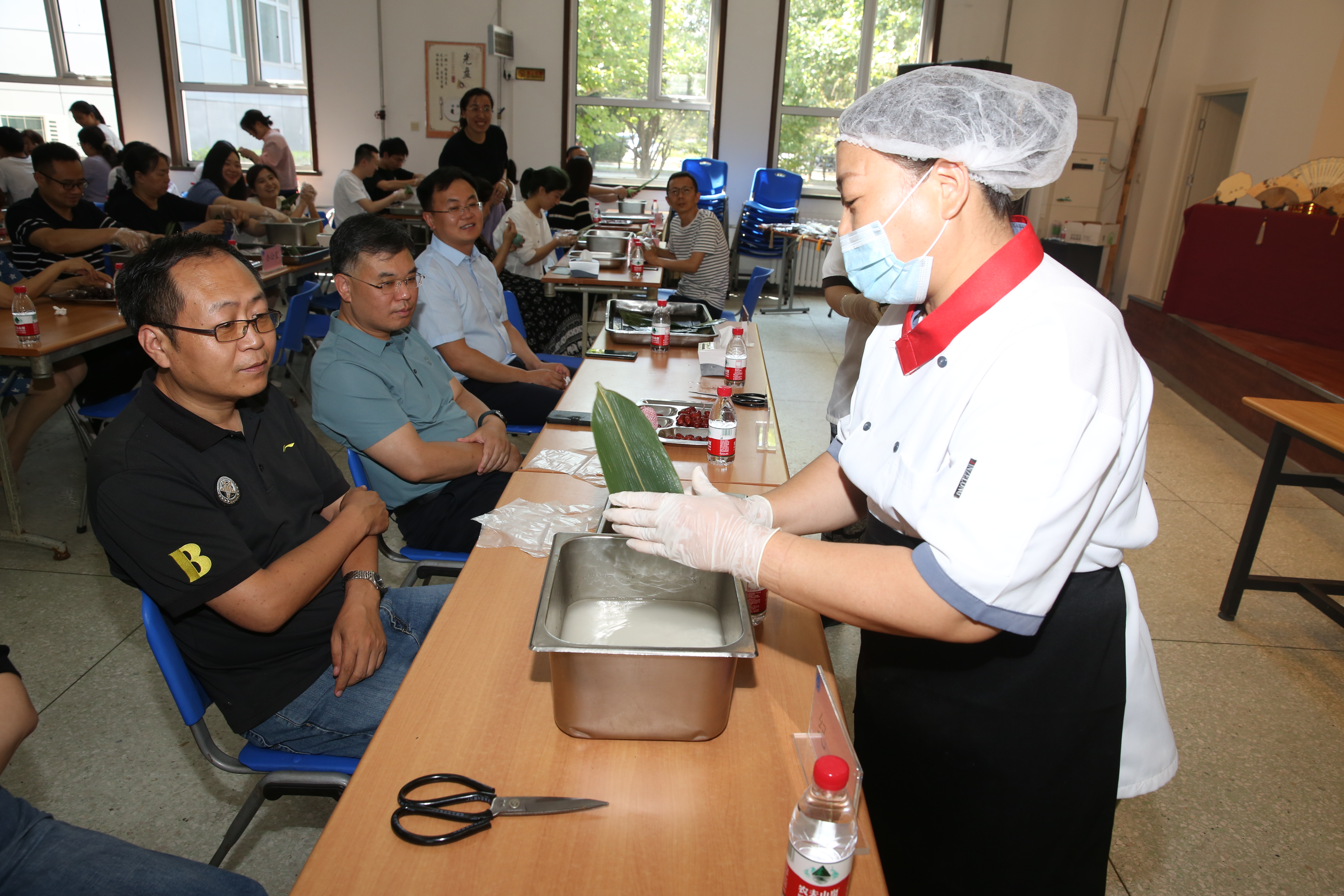 食堂工作人員現(xiàn)場教學(xué)包粽子
