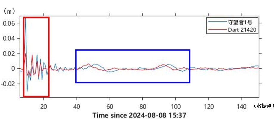 2024年8月8日15時42分(北京時間),日本九州島海域(31.85°N,131.57°E)發生7.1級地震并引發海嘯。距離震源約500公里,由國家海洋技術中心自主研制的“守望者1號”海嘯浮標于當日15時45分監測到海平面異常波動,并實時發出海嘯預警。3小時的海嘯預警期間,海嘯浮標岸站系統共收到16組15s采樣間隔和256組1min采樣間隔的海平面高度數據,海嘯預警期間數據接收率100%。自然資源部海嘯預警中心專家對相關數據進行了分析,認為浮標系統信號記錄清晰、運行穩定,經受住了地震海嘯事件考驗,將為我國海嘯災害預報和海嘯波分析研究提供重要依據。